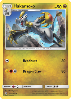 So as far as strategy goes, since Hakamo-o is a Stage 1 Pokemon card, you'll first have to get Jangmo-o into play (I reviewed Jangmo-o from this set yesterday) and then evolve Jangmo-o into Hakamo-o. Jangmo-o does have a Stage 2 evolution in Kommo-o GX, which I'll be reviewing tomorrow, that you'll probably want to use with this Pokemon line but since I haven't reviewed that card yet, the strategy below will act like Hakamo-o is the final evolution in this line. So if you read my review of Jangmo-o, you'll know that I thought it was a below average Basic Pokemon card overall. The card did have a solid HP, move, and Ability, but the card's move required two distinct types of Energy, making it slow on the Attack, and its Ability only affected Jangmo-o, it couldn't help the rest of your deck. So knowing this about Jangmo-o and looking at this Hakamo-o card, this card is very similar in that it is decent overall, with a good HP, and two solid moves, but because this card's Dragon Claw move requires two distinct Energy types, this Pokemon would only work in a dual type deck of Fighting and Lightning type Pokemon. Both moves on this card are good and do a good amount of damage, plus this card has a quick attack, requiring only one Energy to do 30 damage, but I still don't think this is enough to want to use this line without Kommo-o GX in a deck.